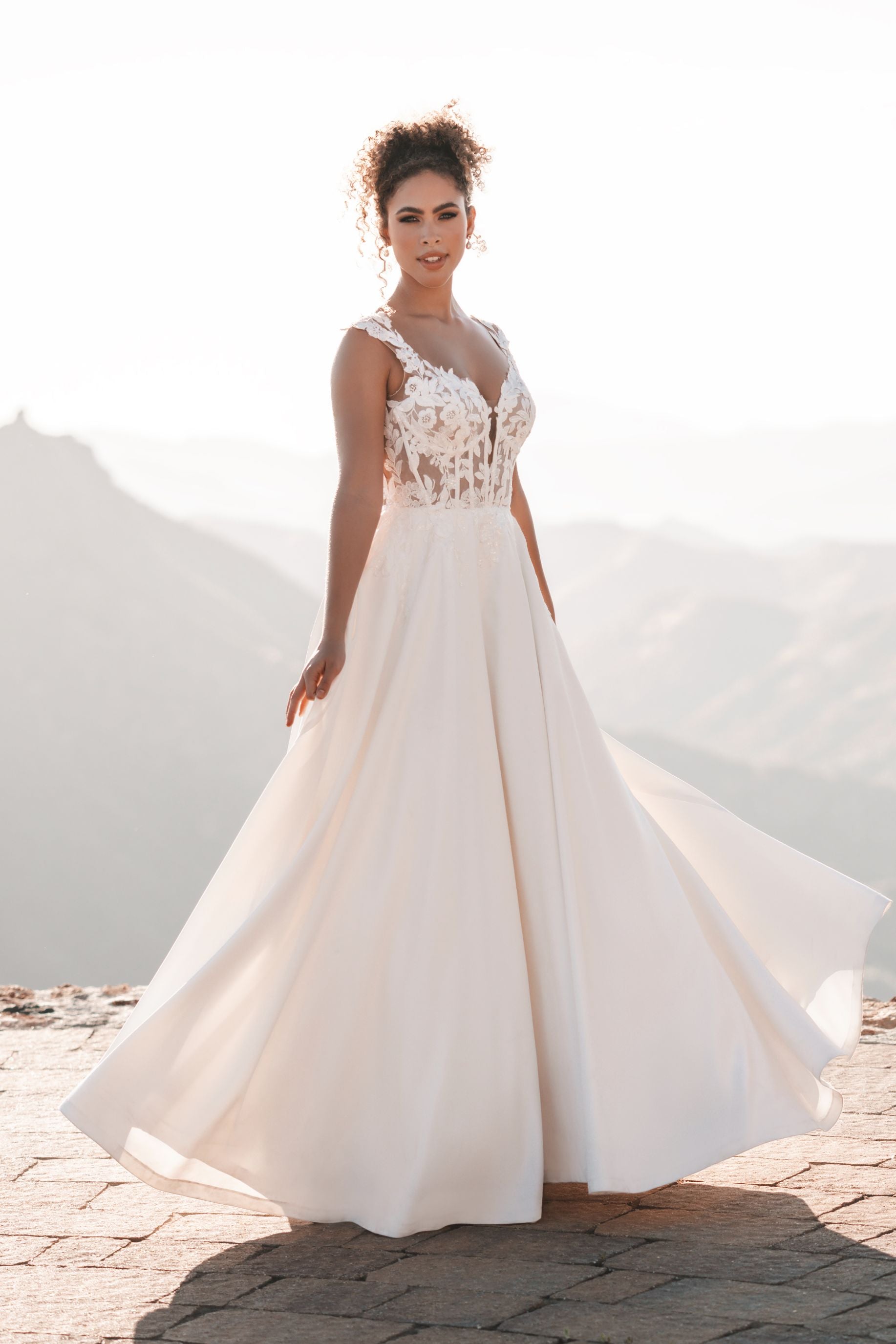 Regal dove satin, paired with sequined lace appliques, crafts a bridal ballgown worthy of royalty.